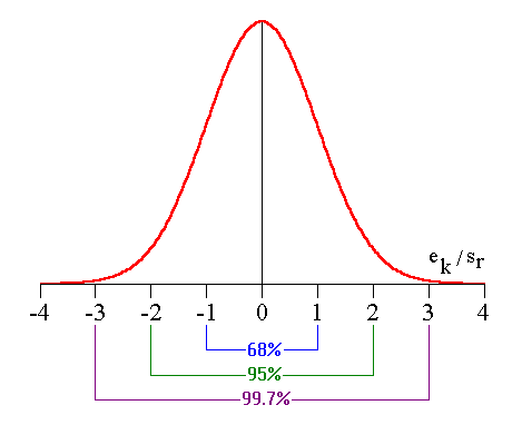 où ek représente l'erreur de mesure de yk (encore appelée résidu). Les calculs précédents supposent que : L'interprétation probabiliste consiste à considérer l'erreur ek comme une variable aléatoire distribuée selon une loi normale de moyenne 0 et d'écart-type s. On montre alors que : I.E.2. Test des résidusLes résidus normalisés, ek / sr, sont distribués selon une loi normale réduite (c'est-à-dire de moyenne 0 et d'écart-type 1). La figure 2 indique l'allure de la distribution (courbe de Gauss) et donne la proportion de résidus qui doivent tomber dans un intervalle donné.