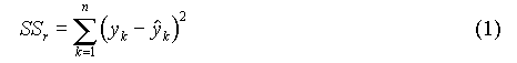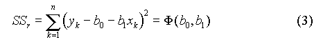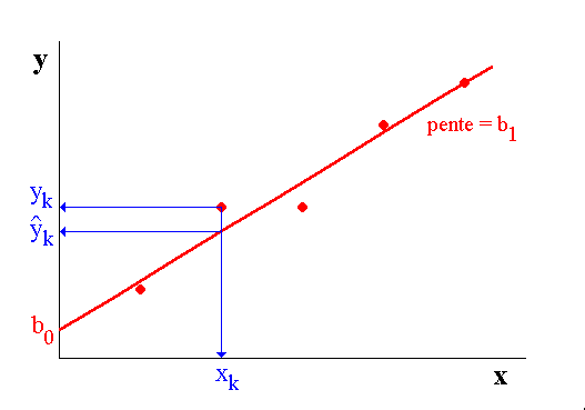 Du fait de l'erreur sur y, les points expérimentaux, de coordonnées (xk, yk), ne se situent pas exactement sur la droite. Il faut donc trouver l'équation de la droite qui passe le plus près possible de ces points. La méthode des moindres carrés consiste à chercher les valeurs des paramètres b0 et b1 qui rendent minimale la somme des carrés des écarts résiduelle (SSr : sum of squared residuals ) entre les valeurs observées yk et les valeurs calculées de y :