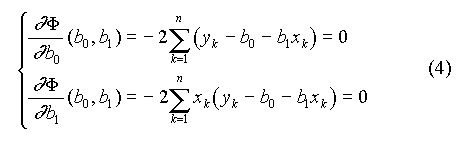 Cette relation fait apparaître la somme des carrés des écarts comme une fonction des paramètres b0 et b1. Lorsque cette fonction est minimale, les dérivées par rapport à ces paramètres s'annulent :