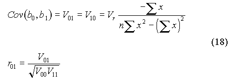 On retrouve ainsi les équations (9). Le terme non diagonal, V01 (égal à V10 puisque la matrice est symétrique) représente la covariance des deux paramètres. On en déduit leur coefficient de corrélation r01 (à ne pas confondre avec le coefficient de corrélation r entre les variables x et y) :